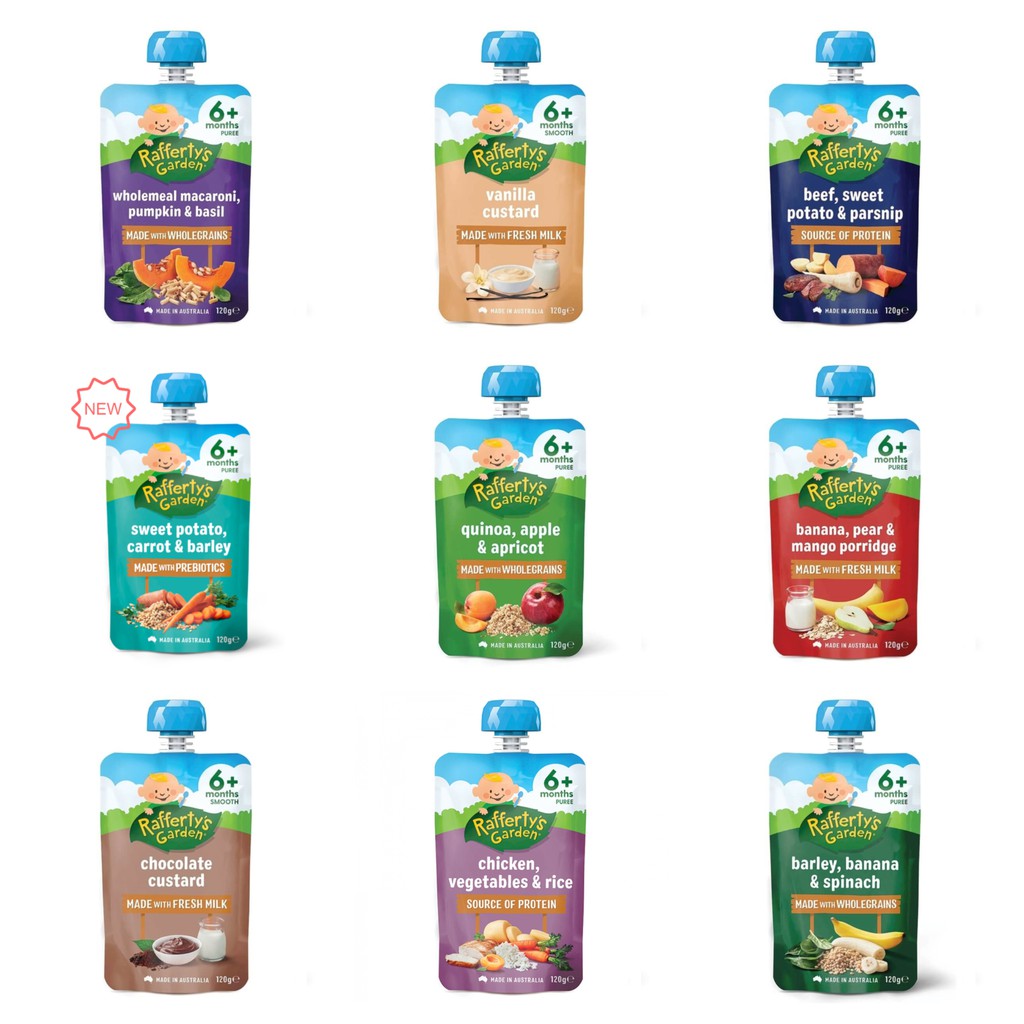 Australias fastest growing baby store. Our 6 Month baby food puree pouches are the ideal choice to help your baby get the best nutritional value from their meals. Raffertys Garden Multigrain Banana Apricot Cereal.